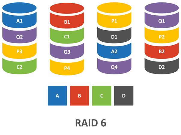 В отличие от RAID 5 этот массив использует две контрольные суммы и два диска четности, поэтому для него понадобятся 4 диска, при этом допускается выход из строя двух из них. Также, как и у RAID 5 алгоритм позволяет использовать всего две контрольные суммы вне зависимости от ширины полосы и общий объем массива всегда будет равен объему всех дисков за вычетом двух. При отказе одного диска RAID 6 выдерживает отказ еще одного, либо ошибку чтения без фатальных последствий.