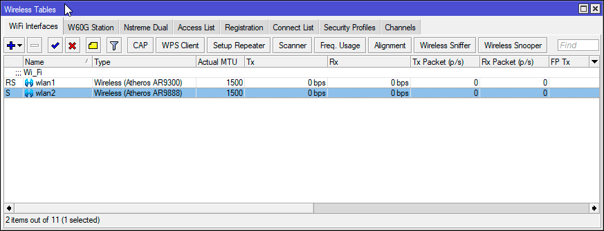 Все настройки беспроводной связи RouterOS расположены в разделе Wireless, открыв который мы увидим список беспроводных интерфейсов, в зависимости от модели роутера их будет один (2,4 ГГц) или два (2,4 ГГц + 5 ГГц). Большинство настроек для обоих диапазонов одинаково, поэтому мы будем рассматривать их применительно к диапазону 2,4 ГГц, делая необходимые отступления там, где появляются специфичные для диапазона 5 ГГц параметры.