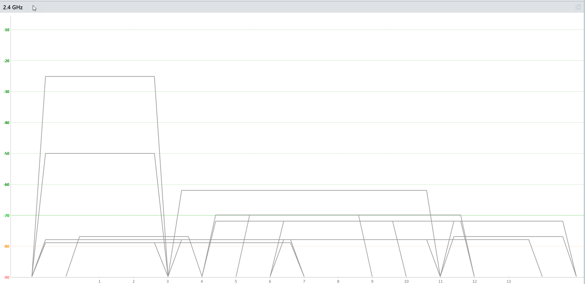 Как видим, все не очень хорошо, если не сказать по-другому. Более-менее свободными являются края диапазона, при этом выбрать начало более предпочтительно, как по эфирной обстановке, так и по причинам совместимости, многие устройства, например, продукция Apple не работают выше 11-го канала.