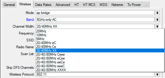 При выборе широкого канала вам нужно указать основную частоту, либо разрешить это делать автоматически. В Mikrotik используется следующая аббревиатура: буква C обозначает основной канал, е - дополнительные. Например, Ce обозначает, что дополнительный канал отстоит от основного вверх по диапазону (1+5, основной канал 1), eC - наоборот (5-1, основной канал 5). Не все варианты допустимы, если вы выберете основным первый канал, то единственное допустимое значение будет Ce, так как ниже по диапазону нет разрешенных к использованию частот. В диапазоне 5 ГГц вариантов будет больше, но принцип остается тем же.