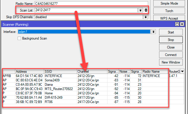 Scan List - диапазон частот, в котором Mikrotik будет проводить сканирование эфирной обстановки и мониторинг загрузки каналов. По умолчанию - весь доступный согласно региональным настройкам диапазон, вручную можно указать отдельную частоту или диапазон частот, либо список каналов созданный в Wireless - Channels.