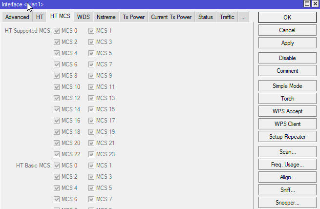 Есть и еще одна особенность, данная закладка показывает индексы поддерживаемые RouterOS, а не конкретным радиомодулем. Скриншот выше сделан на роутере hAP, который имеет два радиоканала и просто физически не может поддерживать индексы MCS 16 - 23, которые подразумевают три пространственных потока.