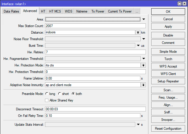 Hw. Retries - достаточно интересный и важный параметр - количество повторных посылок кадра в случае сбоя передачи, после чего скорость будет понижена и кадр будет отправлен вновь. После трех неудачных попыток отправить кадр на самой низкой скорости передача будет остановлена на время, указанное в опции On Fail Retry Time. Кадр передается повторно до тех пор, пока не будет успешно доставлен, либо клиент не отключится по таймауту, который задан в опции Disconnect Timeout, либо не истечет время жизни кадра, которое указано в параметре Frame Lifetime.