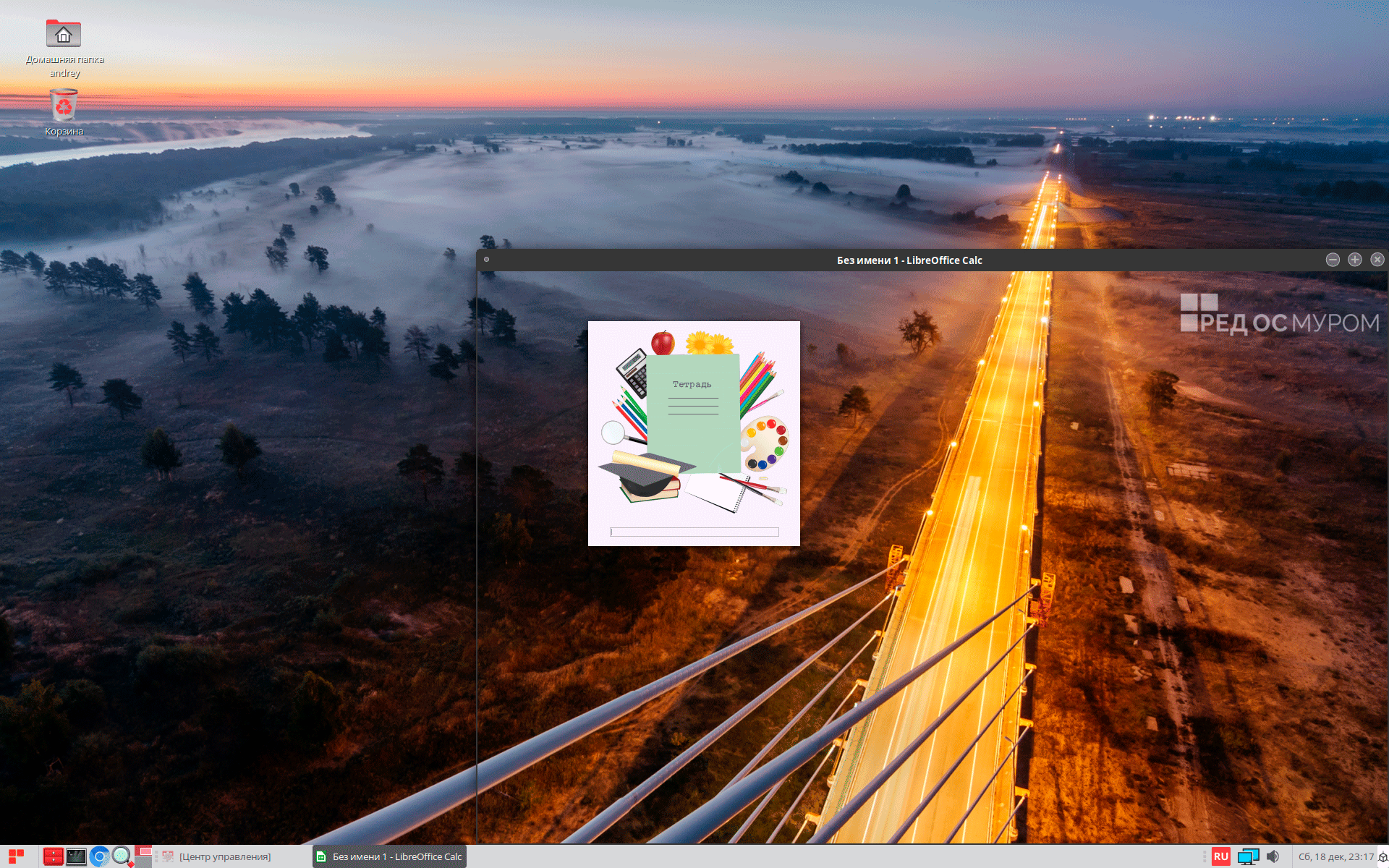 После аутентификации нас встречает рабочий стол, в качестве оболочки рабочего стола выбрана Mate, но доработана так, что сразу ее и не узнать. Интерфейс спроектирован так, чтобы вызывать наименьшие затруднения у пользователей переходящих с Windows и, нужно сказать, получилось весьма неплохо. Кстати, на обоях рабочего стола изображен Муромский вантовый мост.