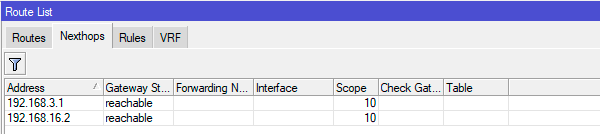 Перед тем, как переходить к дальнейшим настройкам нам нужно выяснить и запомнить адреса шлюзов провайдеров, для этого можно заглянуть на закладку Nexthops, для коммутируемых подключений (VPN, PPPoE) следует проверить свойства соответствующего соединения.
