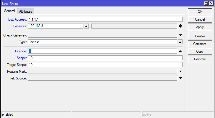 2add distance=1 dst-address=1.1.1.1/32 gateway=192.168.3.1 scope=10