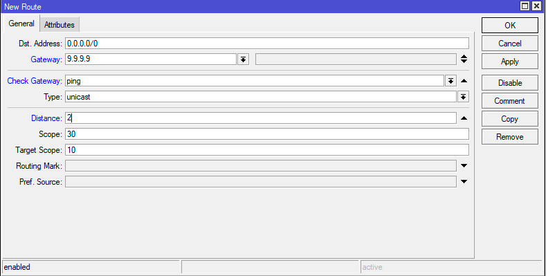 Dst. Address - 0.0.0.0/0, Gateway - 9.9.9.9, Check Gateway - ping , Distance - 2. Обратите внимание на значение административной дистанции второго маршрута, она должна быть больше, чем у основного провайдера, в нашем случае - 2.