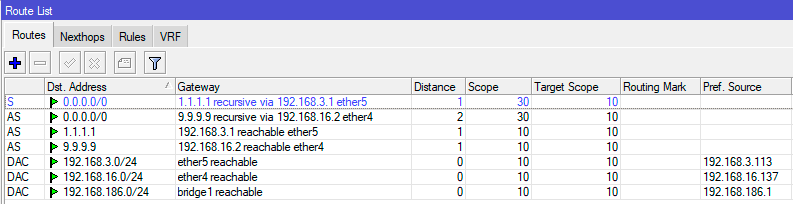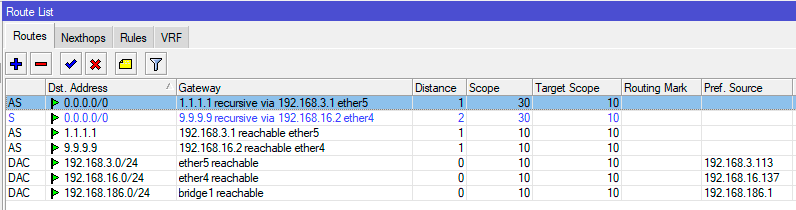 Где Dst. Address - 1.1.1.1 - узел для проверки первого провайдера, Gateway - 192.168.3.1 - шлюз первого провайдера, Distance - 1, Scope - 10. Обратите внимание на значение области (Scope), если вы оставите там значение по умолчанию - 30, то рекурсивная маршрутизация работать не будет! Затем добавим второй аналогичный маршрут, но уже к узлу 9.9.9.9 через шлюз второго провайдера.