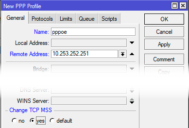 Для этого перейдем в PPP - Profiles и создадим новый профиль, укажем для него понятное имя и зададим параметр - Remote Address, адрес можно указать любой, единственное условие - он не должен пересекаться с вашими внутренними сетями, в нашем случае это 10.253.252.251. Также установите переключатель Change TCP MSS в положение yes.