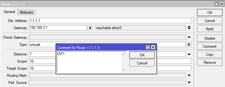 Прежде всего добавим к маршруту для высокодоступного узла через шлюз провайдера уникальный комментарий, например, ISP1.
