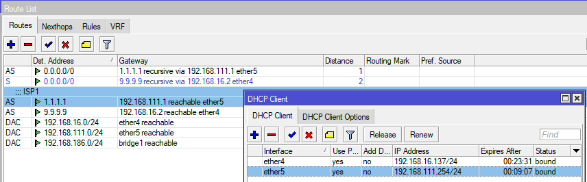 Наши маршруты добавились как рекурсивные и активным является маршрут через основного провайдера. Теперь имитируем аварию у первого провайдера, буквально через 10-20 секунд таблица маршрутизации изменится и рабочим станет маршрут через резервный канал: