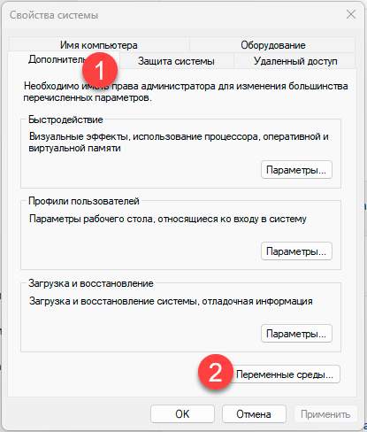 Чтобы удобно работать с утилитами PostgreSQL добавим путь к ним в переменную окружения PATH. Для этого перейдем в Свойства системы - Дополнительно - Переменные окружения.