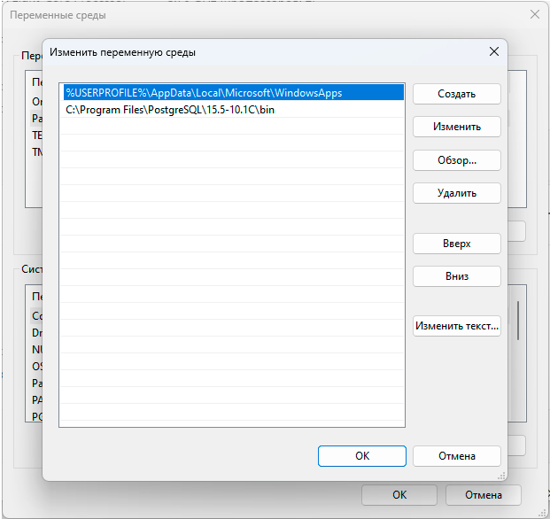 Затем найдем в списке переменную PATH и изменим ее, добавив новой строкой путь к папке bin вашего экземпляра PostgreSQL, в нашем случае это C:\Program Files\PostgreSQL\15.5-10.1C\bin: