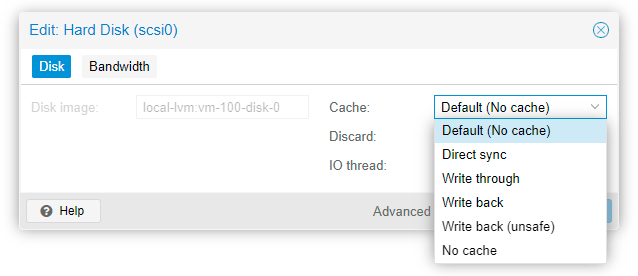 Теперь рассмотрим варианты кеширования для виртуальных дисков KVM, которые доступы в среде Proxmox VE. Ниже показан скриншот из английской версии интерфейса: