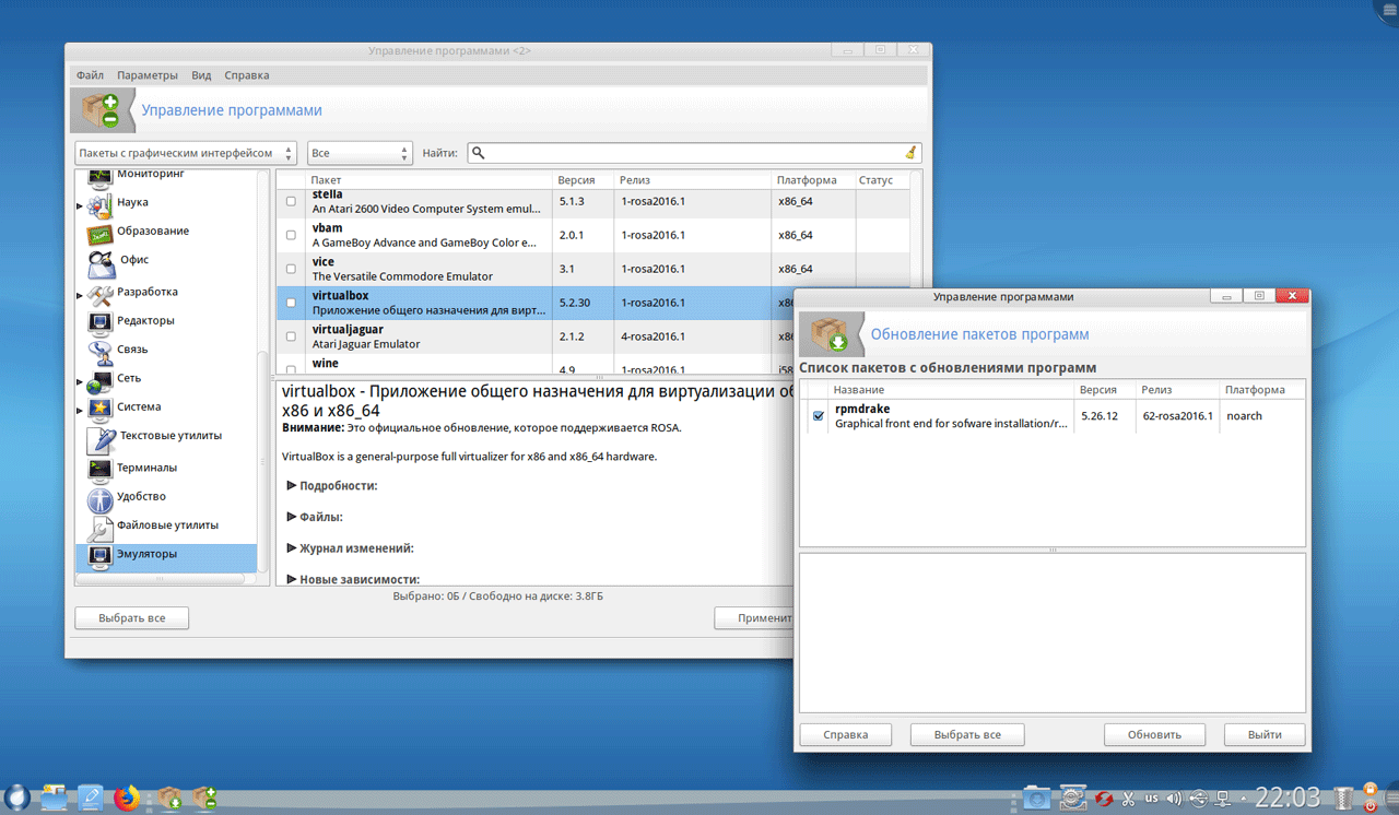 Магазина приложений как такового нет, вместо него имеется утилита Rpmdrake, в которой есть фильтр для приложений с графической оболочкой. Это стандартная утилита классического вида, для неподготовленного пользователя работать с ней будет тяжеловато, современный пользователь избалован магазинами с красивыми иконками. Утилита обновления самая обычная, каких-либо вопросов к ней нет.