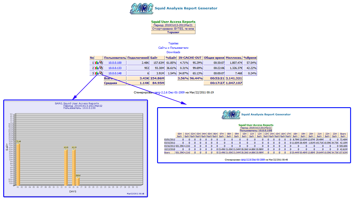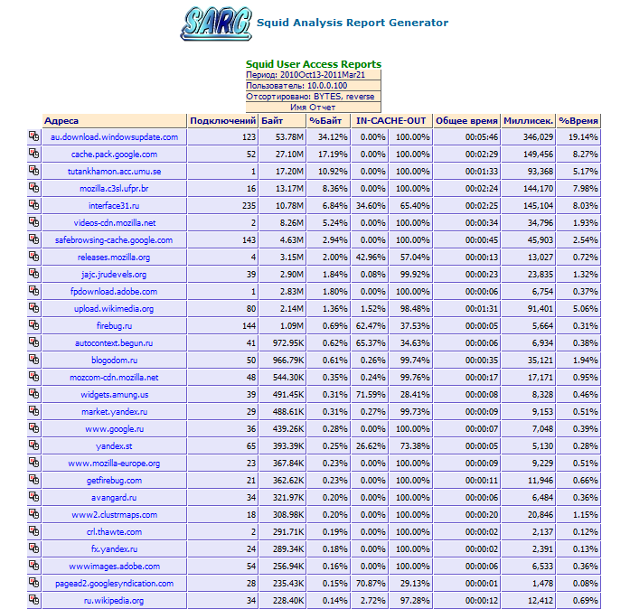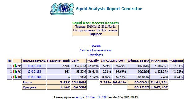 На этом настройку можно считать законченной, вся статистика будет доступна по адресу http://10.0.0.1/squid-reports.