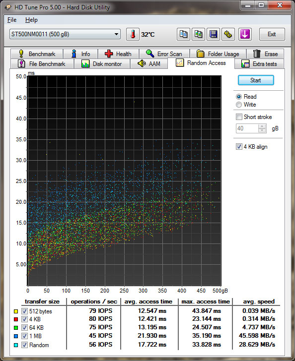 Время случайного доступа - один из самых важных тестов для корпоративного диска, так как чаше всего серверные нагрузки представляют как раз интенсивное случайное обращение к диску. Здесь Constellation ES показывает себя во всей красе - 80 IOPS, что лучше всех массовых моделей, соревноваться с ним на равных может только "черный" Western Digital.