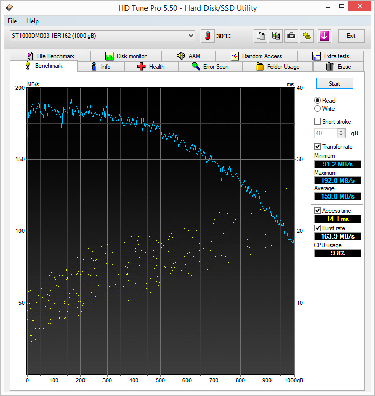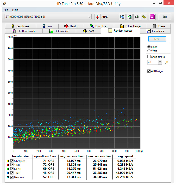 По скорости последовательного доступа диск ничем не выделяется среди одноклассников, зато хорошо виден прирост по сравнению с моделью двухлетней давности, там мы отмечали 140 МБ/с, как отличный результат, сегодня же норма 185-190 МБ/с. А вот характеристики случайного доступа можно сказать не изменились, в тоже время данная модель уступает современному WD и превосходит диск Toshiba, у которого данный параметр вовсе находится на уровне экономичных или ноутбучных моделей.