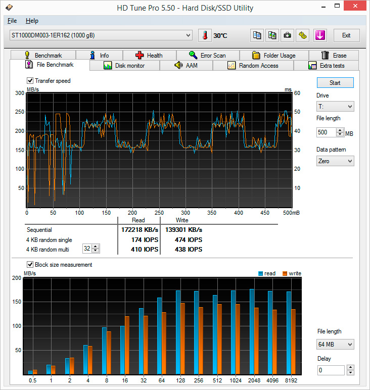 Файловый тест отличается некоторой нестабильностью графика, на те же самые 50 МБ/с, и таким же завалом в области малых размеров блоков, как и у WD. Хотя в целом тест типичен для дисков общего назначения и делать какие-то выводы на его основании не следует. Если сравнивать с предыдущей моделью, то можно отметить нестабильность графиков как отличительную особенность данной серии.