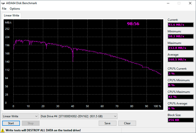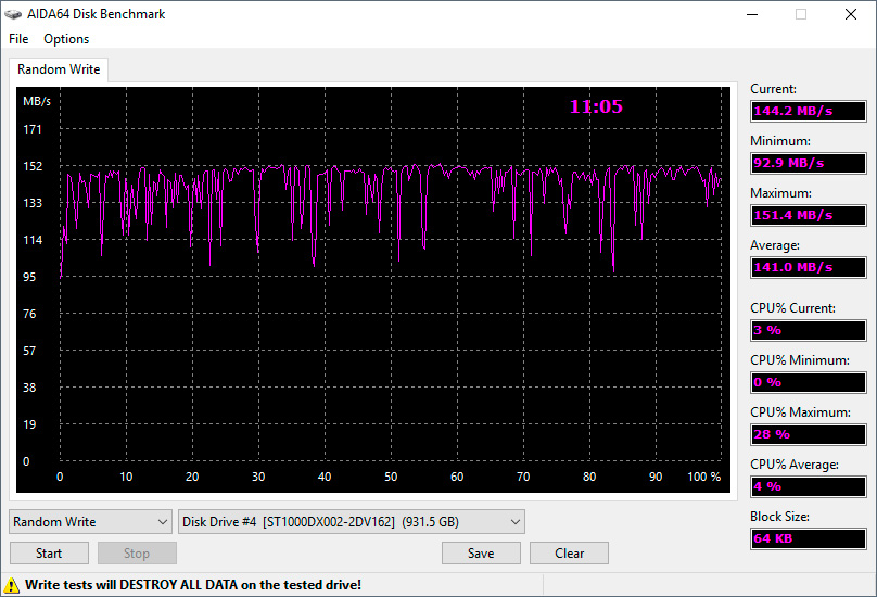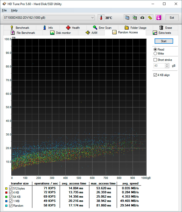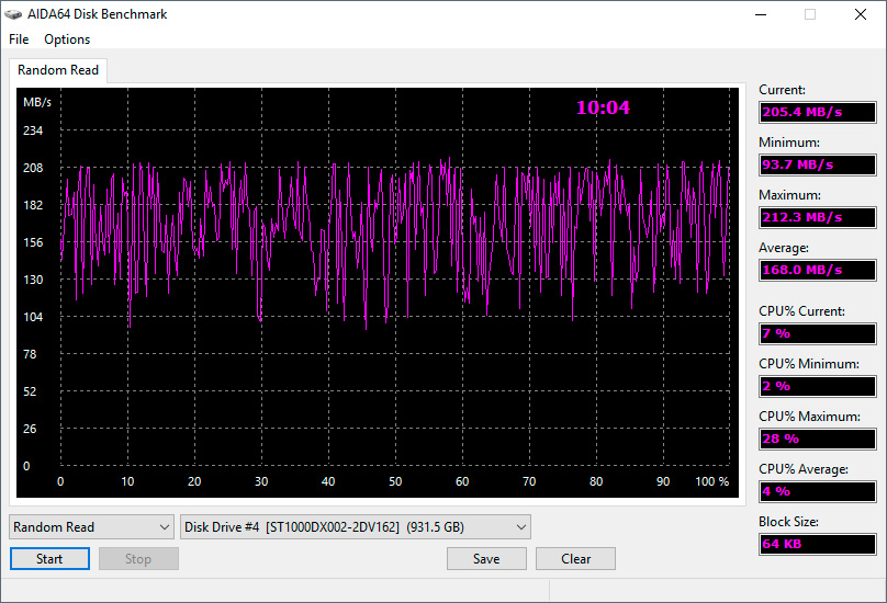 Сразу обращает на себя внимание скорость записи с небольшим размером блока, это снова вступает в дело "гибридность", запись идет сразу в твердотельный кеш, что позволяет обеспечивать высокие результаты, однако чтение по-прежнему производится с пластин HDD, демонстрируя решительную разницу между жесткими дисками и флеш-памятью.