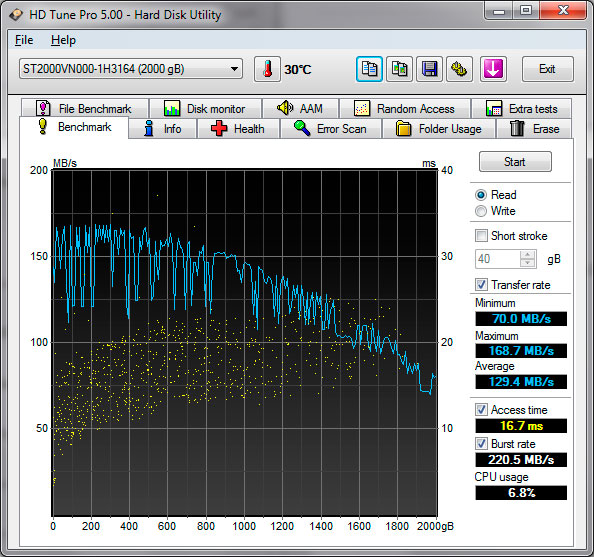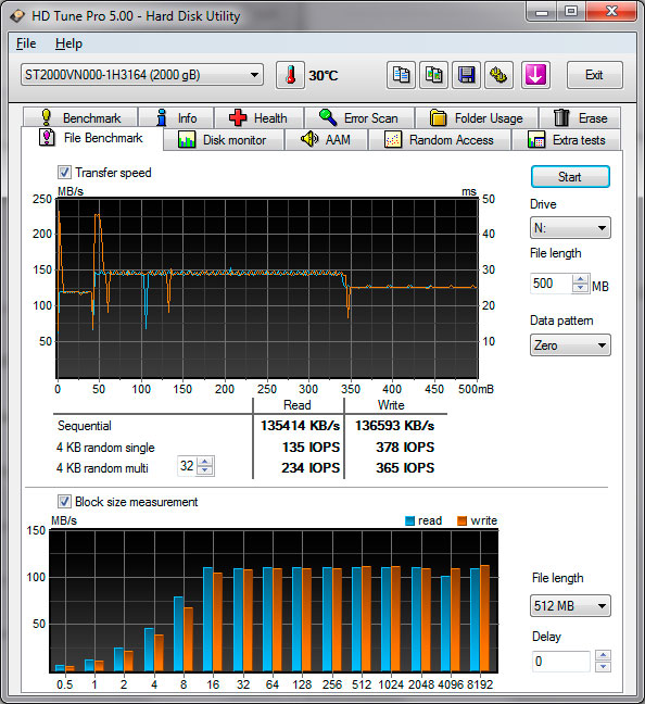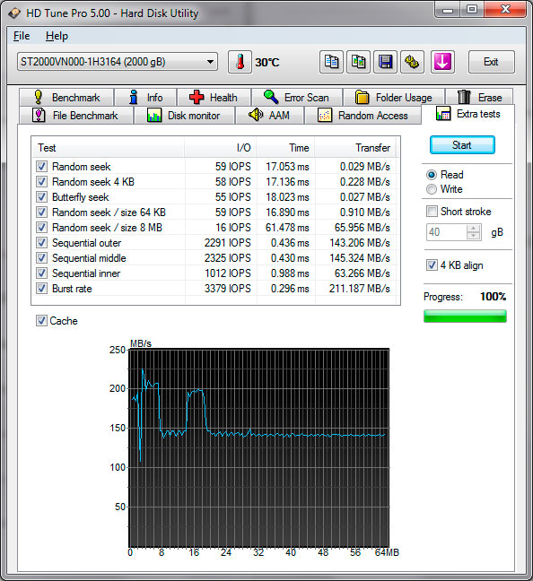 Кривая чтения довольно типична для массовых моделей Seagate, с несколько меньшими скоростями доступа, в тоже время если сравнивать с "красным" WD, диск от Seagate показывает лучшие результаты - более высокую среднюю скорость чтения и меньшее время случайного доступа.