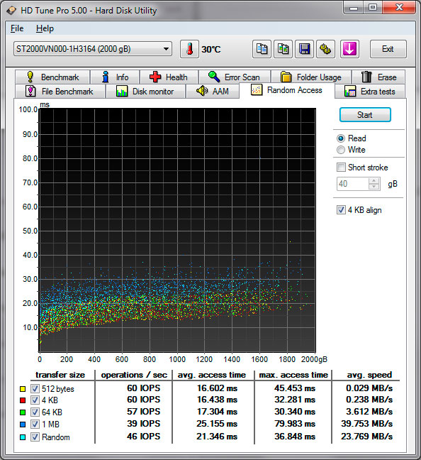 Время случайного доступа - один из наиболее важных тестов. Результаты Seagate NAS тажке невысоки, хотя и превосходят красный WD, но при этом они хуже, чем у дисков массовых серий. Поэтому не рекомендуется использовать данный диск в качестве системного или для размещения требовательных к количеству IOPS данных, например, баз данных или виртуальных машин. В тоже время для типичных задач файлового сервера этот параметр не играет решающей роли.
