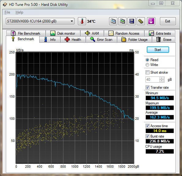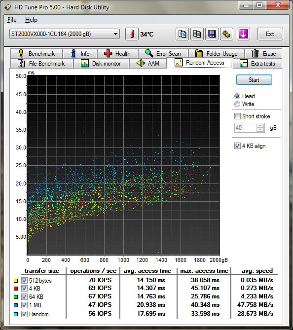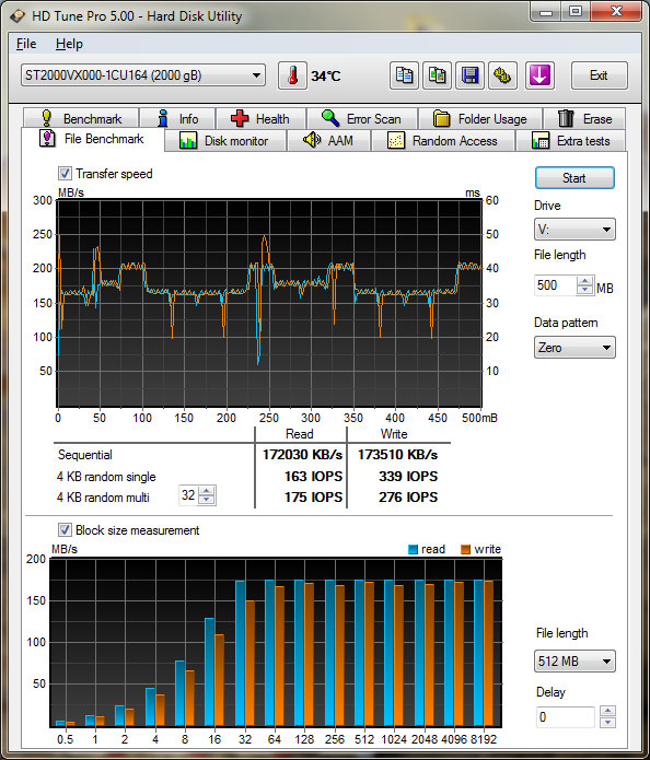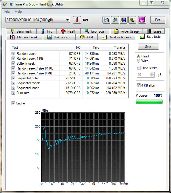 График в HD Tune Pro 5.0 очень сильно нам напомнил Seagate Barracuda ST2000DM001, действительно, если убрать колебания скорости доступа и провести линию по максимальным значениям получим график Seagate SV35. Остальные параметры у двух дисков практически совпадают.