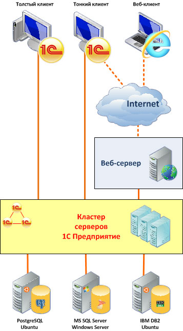 Также система не накладывает никаких требований к платформам. Вы можете совместно использовать как Windows так и Linux сервера, в качестве веб-сервера можно использовать Apache и IIS, из СУБД поддерживаются PostgreSQL, MS SQL Server, IBM DB2 и Oracle. Поэтому никто не мешает вам создать схему, в которой сервер 1С работающий на платформе Linux будет работать совместно с сервером БД под управлением Windows Server и IIS и наоборот. Кроме того вы можете использовать несколько серверов СУБД (как и веб-серверов) располагая разные базы на разных серверах.