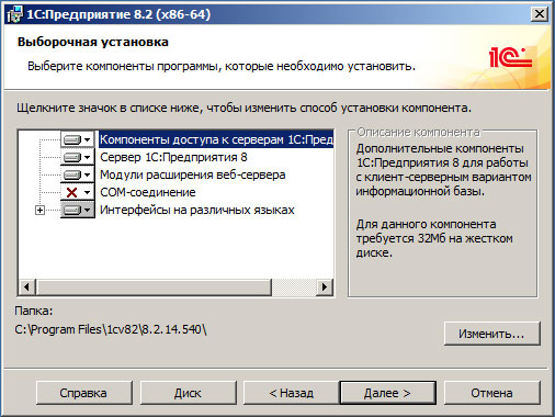 Для установки 32-битной версии сервера используется тот-же самый дистрибутив, что и для установки клиентской части. Запустим программу установки и внимательно изучим окно доступных компонентов: