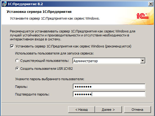 Для запуска служб сервера 1С Предприятия можно использовать учетную запись Администратора или, что будет более правильно и безопасно, специальную учетную запись USR1CV82. Если данная учетная запись не существует вам будет предложено ее создать во время установки.