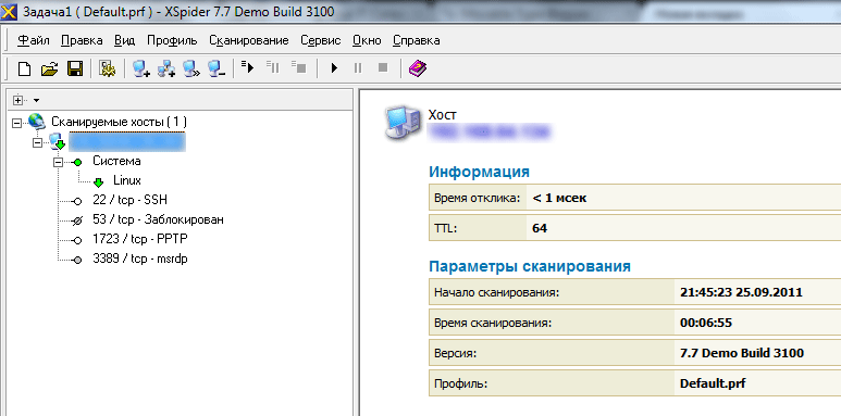 Хорошим помощником в деле обеспечения безопасности будет сканер уязвимостей, которым следует просканировать внешний интерфейс сервера. Мы использовали демо-версию одного из самых известных продуктов - XSpider 7.7.
