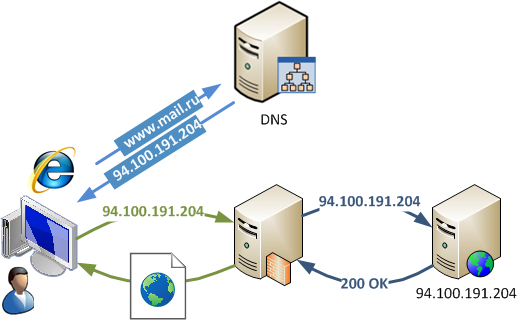 Итак, пользователь набрал в адресной строке имя сайта. Следующим шагом будет отправка запроса DNS серверу, указанному в сетевых настройках. Он может выдать результат из кэша или перенаправить запрос вышестоящему серверу. В результате мы получим ответ, что введенному нами символьному имени mail.ru соответствует IP адрес 94.100.191.204. Запрос по данному адресу будет направлен к роутеру, который в свою очередь сравнит адрес назначения с текущими правилами брандмауэра и либо отклонит его, либо передаст дальше. Сервер назначения, получив запрос, сформирует ответ и передаст его запросившему клиенту, в данном случае роутеру. Произведя необходимую фильтрацию, роутер передаст ответ тому ПК, с которого был сделан запрос и пользователь увидит на своем экране содержимое веб-страницы (либо страницу блокировки, если запрошенная страница по какой-то причине не прошла фильтрацию).