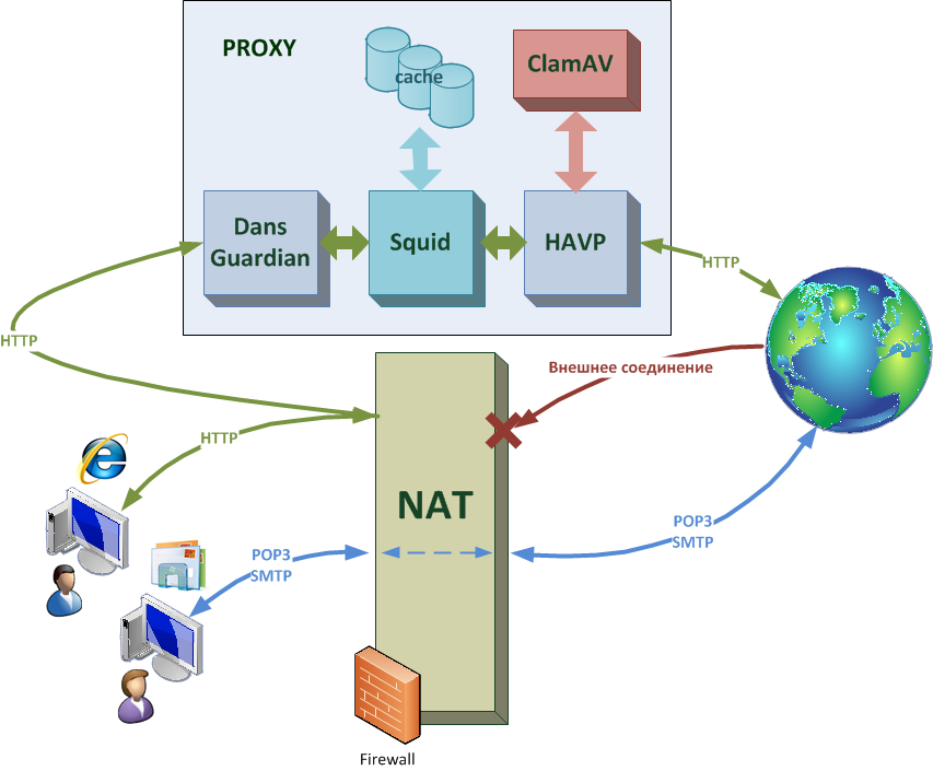 В нашем случае прокси-сервер представляет собой каскад из контент-фильтра DansGuardian, кэширующего прокси-сервера Squid и антивирусного прокси HAVP.