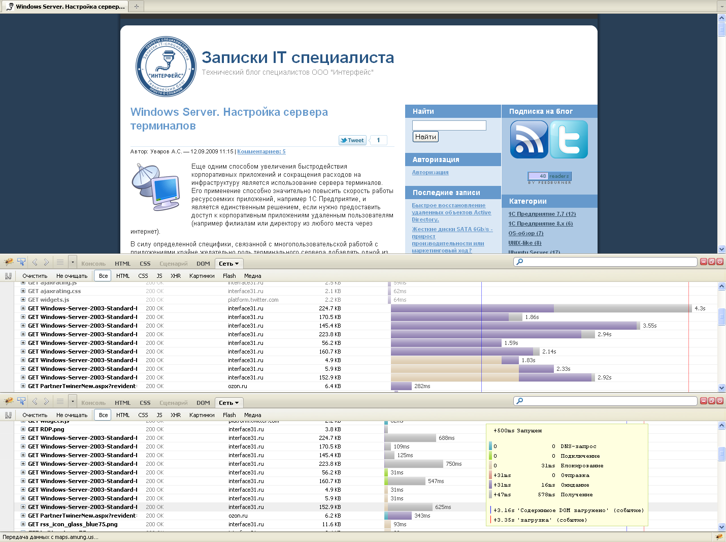 Исходящий запрос обрабатывается только кеширующим прокси Squid, который проверяет наличие запрашиваемого объекта в кэше и либо отдает объект, либо перенаправляет запрос серверу назначения. Не следует недооценивать роль кэширующего прокси-сервера, мы провели простой эксперимент: с двух ПК последовательно запросили одну и ту же страницу, предварительно очистив кэш браузера и кэш прокси-сервера.