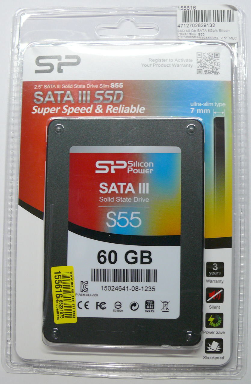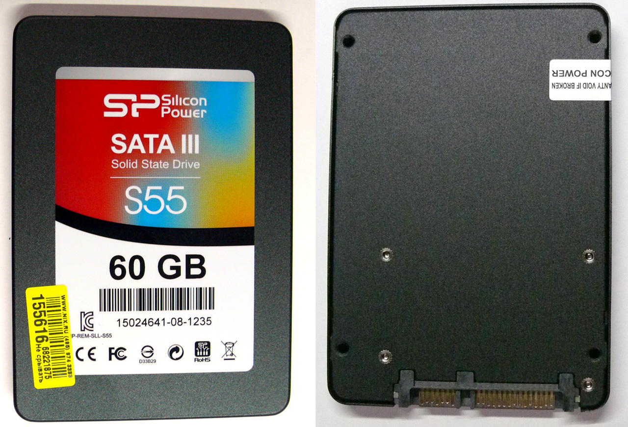 Нам в руки попал 60 GB Silicon Power Slim S55 (SP060GBSS3S55S25), как раз таки на контроллере SandForce, что нас, первоначально, не сильно расстроило. Phison, конечно, был бы предпочтительнее, но там, куда этот диск предназначался, это было не принципиально.