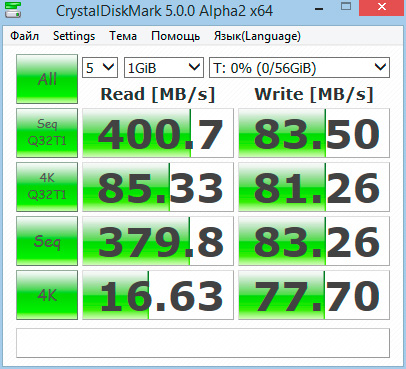 Здесь все не так уж и плохо, примерно на уровне 60 ГБ Smartbuy, однако следует понимать, что если для Phison данный результат показывает некоторое среднее значение и на определенных наборах данных диск может показывать большую производительность, то для данной модели это, к сожалению, потолок.
