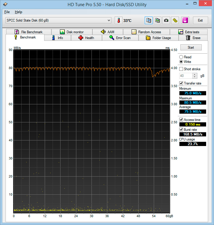 А вот здесь нас ждал первый сюрприз, скорость на хорошо сжимаемых данных (сильная сторона SandForce) не превышала такую на несжимаемых и уперлась в планку 80 МБ/с. Это говорит о том, что Silicon Power сэкономили не только на контроллере, но и на памяти, поставив минимальное количество чипов максимальной емкостью, что не позволило задействовать все каналы контроллера и достичь номинальной для него скорости.