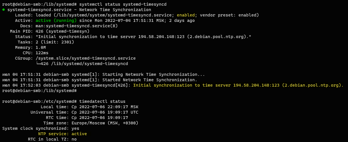 Как можно увидеть из вывода первой команды служба синхронизации работает и включена ее автозагрузка, ниже, в строках лога видно, что выполнена синхронизация с одним из серверов debian.pool,ntp.org. Вторая команда показывает текущее время, часовой пояс, а также то, что синхронизация с помощью systemd-timesyncd включена.