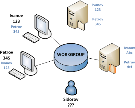 В нашей рабочей группе имеются два ПК на которых работают пользователи Иванов (логин: Ivanov, пароль 123) и Петров (логин: Petrov, пароль 345). Для того, чтобы Иванов имел доступ к общим ресурсам Петрова, на его (Петрова) компьютере необходимо добавить учетную запись Ivanov и наоборот. Через некоторое время в сети появляется файловый сервер, на котором необходимо добавить все учетные записи пользователей, которые должны иметь доступ к его ресурсам. Отдельно стоит поговорить об организации доступа в интернет, обычно для этого используют стороннее ПО со своим списком пользователей и своим методом авторизации, что выливается в еще один список пользователей и еще один набор паролей.