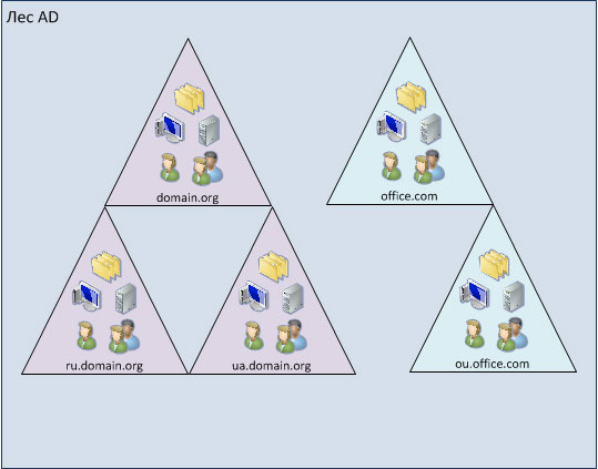 Основой структуры каталога является домен, это административная единица внутри которой действуют свои правила и политики, домен представляет собой еще одну границу безопасности и репликации. Если границу леса можно сравнить с государственной границей, то границы домена представляют границы административных единиц, любой пользователь любого домена может получить доступ к любому объекту другого домена если, конечно, имеет на это права. Репликация (синхронизация каталога между контроллерами домена) также ограничена границами домена, это значит что записи об объектах этого домена будут храниться только в его пределах и не будут доступны администратору другого домена. Это позволяет разграничить полномочия IT-персонала: каждый отдел отвечает за свой домен и ошибки администратора одного из доменов не приведут к выходу из строя всей сети.