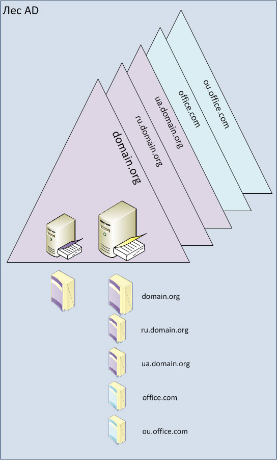 Постепенно фирма развивается и возникает необходимость выделить отдельно региональные подразделения, допустим российское и украинское, текущее подразделение будет выполнять административные функции и также должно управляться отдельно. Нет проблем, создаем еще два домена: ru.domain.org и ua.domain.org, которые имеют с корневым доменом общее пространство имен, получившая схема носит название дерева доменов. В свою очередь в пространстве имен региональных доменов можно создать домены для более мелких подразделений, например spb.ru.domain.org.