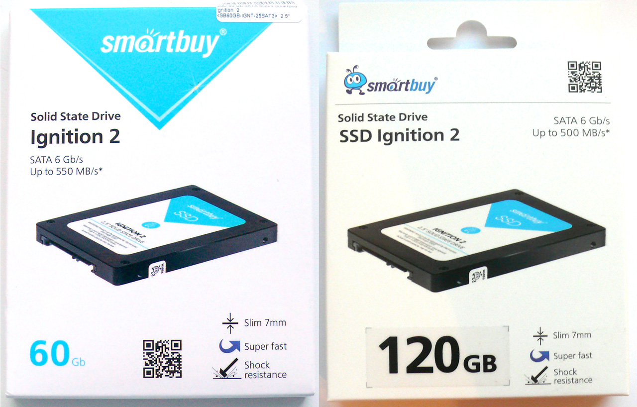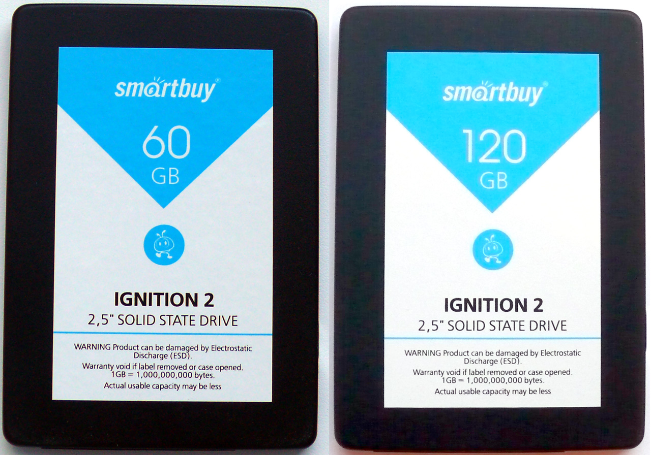 Итак, самое время познакомиться поближе: 60 GB SmartBuy Ignition 2 SB60GB-IGNT-25SAT3 и 120 GB SmartBuy Ignition 2 SB120GB-IGNT-25SAT3. Обе модели поставляются в небольших картонных коробках без всяких изысков.