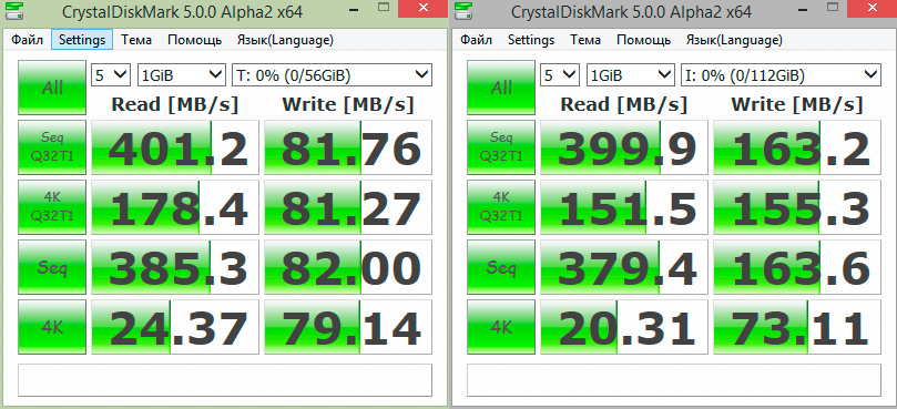 Тестирование, как обычно, начнем с CrystalDiskMark5, здесь и далее, если не будет указано иное, слева результаты модели на 60 ГБ, справа на 120 ГБ.
