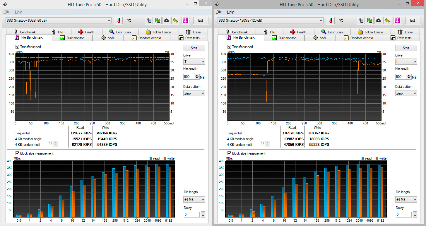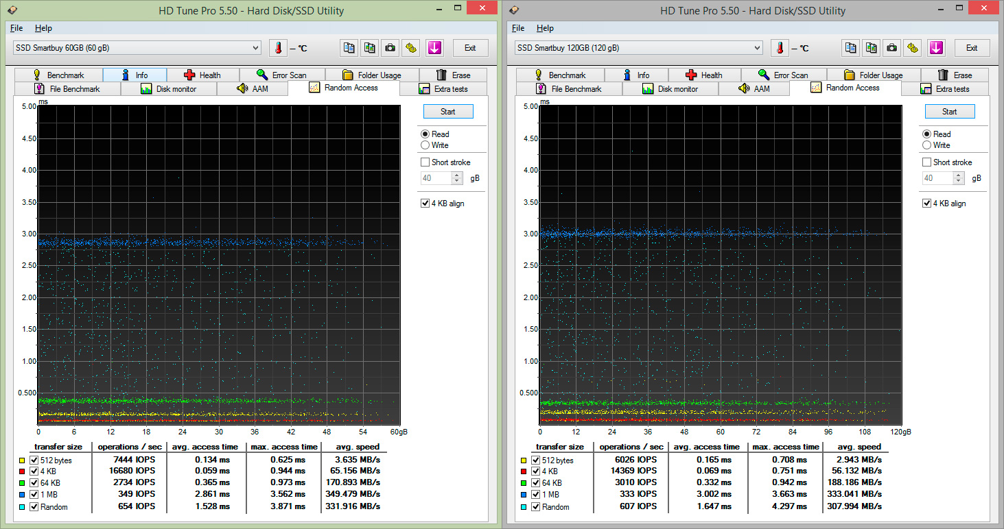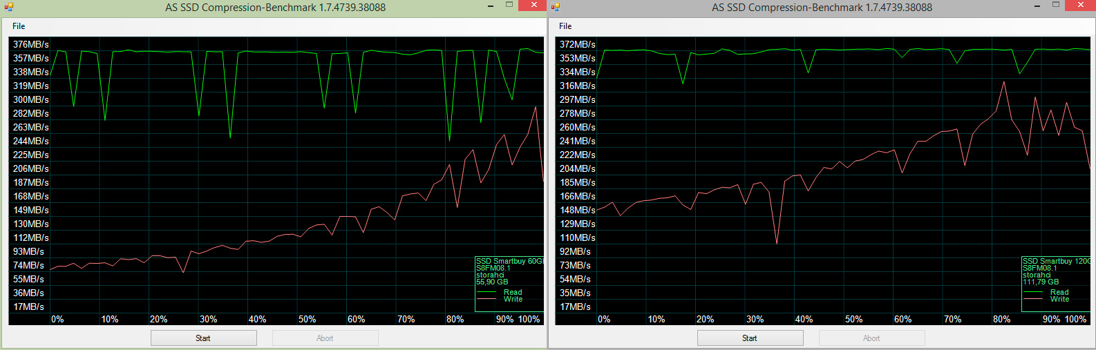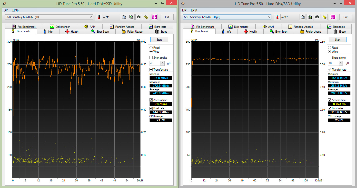 А вот и подтверждение того, что с хорошо сжимаемыми данными контроллер показывает гораздо более высокую производительность. Здесь она примерно соответствует заявленной, а для 60 ГБ диска даже существенно ее превосходит. И снова можно отметить, что диски имеют практически одинаковые характеристики, разве что у старшей модели более ровные графики.