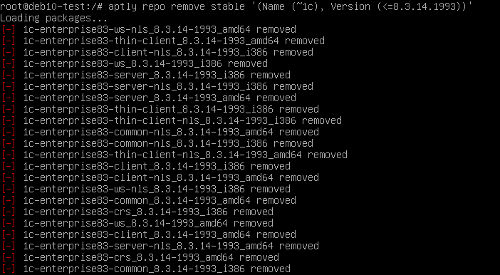 По мере того, как вы будете добавлять в репозитории новые пакеты там будут скапливаться старые версии, которые имеет смысл эпизодически удалять, в том числе и для экономии свободного места. Скажем, мы решили удалить пакеты платформы 8.3.14. Прежде всего удалим их из репозитория, для этого выполните команду: