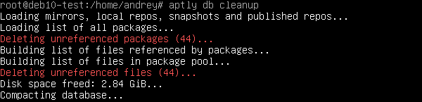 Несмотря на то, что мы удалили пакеты из репозитория физически они остаются храниться на диске и удалить их можно будет только после того, как они перестанут использоваться во всех опубликованных репозиториях. Поэтому если мы удалили пакеты платформы 8.3.14 из репозитория stable, но оставили их в oldstable, либо не опубликовали изменения, то удалить с диска эти пакеты нельзя. Для удаления неиспользуемых пакетов используйте команду: