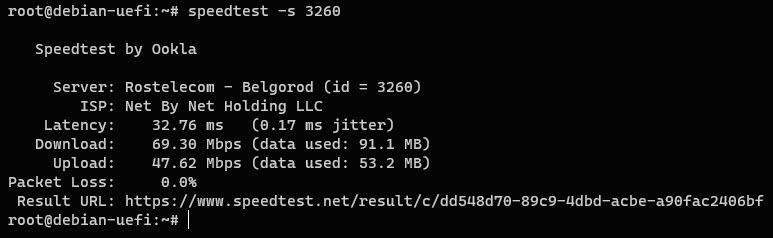 Пользоваться ей очень просто, если мы запустим ее без аргументов, то будет выполнен тест с автоматическим выбором ближайшего сервера и выводом результатов в терминал: