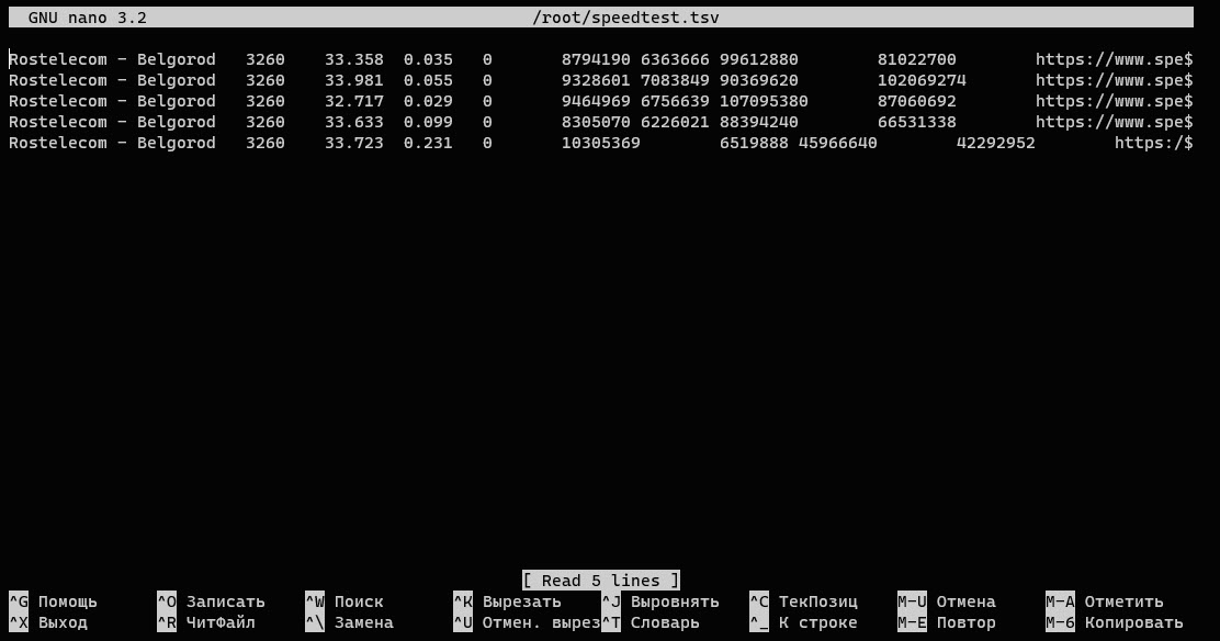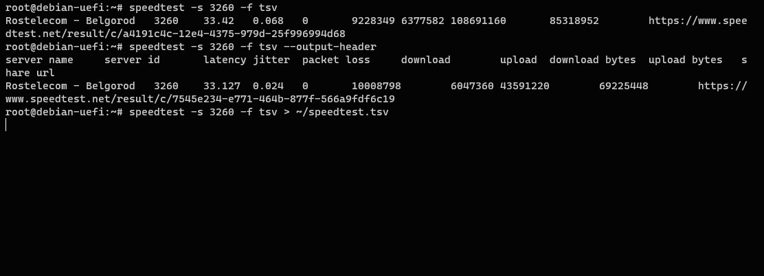 1speedtest -s 3260 -f tsv > ~/speedtest.tsv