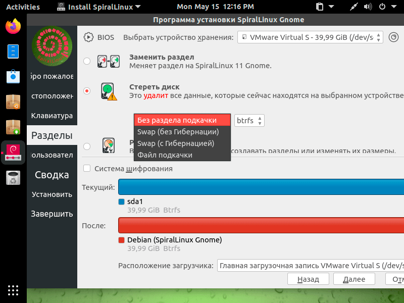 По умолчанию предлагается разметка btrfs без раздела подкачки, в этом случае будет активирован zRAM своп. При желании здесь же можно выбрать вариант с классическим разделом подкачки, при этом инсталлятор сам правильно выберет его размер в зависимости от сценария использования устройства.
