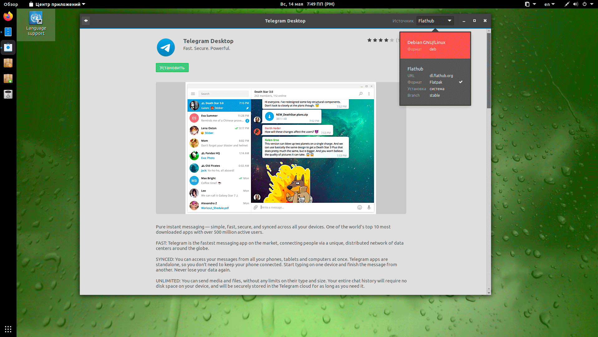Магазин, как мы уже говорили выше, интегрирован с Flatpak и при наличии альтернатив он является предпочтительным. На наш взгляд это правильно, так как версии ПО в официальных репозиториях могут быть не только старыми, а откровенно устаревшими, как, например, Telegram версии 3.1.1, против актуальной версии 4.8.1 в Flatpak.